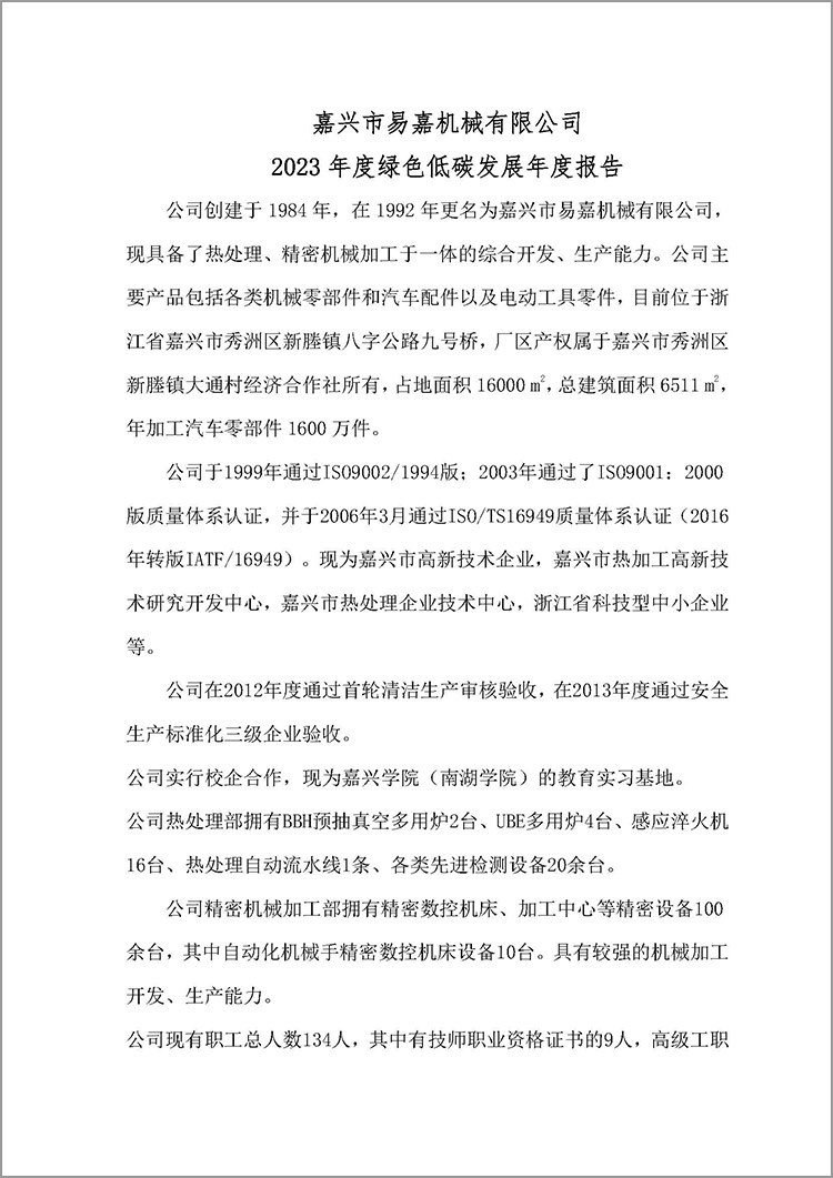 嘉興市易嘉機械有限公司2023 年度綠色低碳發(fā)展年度報告