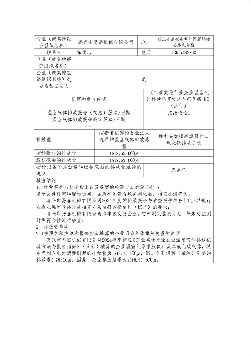 嘉興市易嘉機械有限公司產品碳足跡核查報告(2024年度)